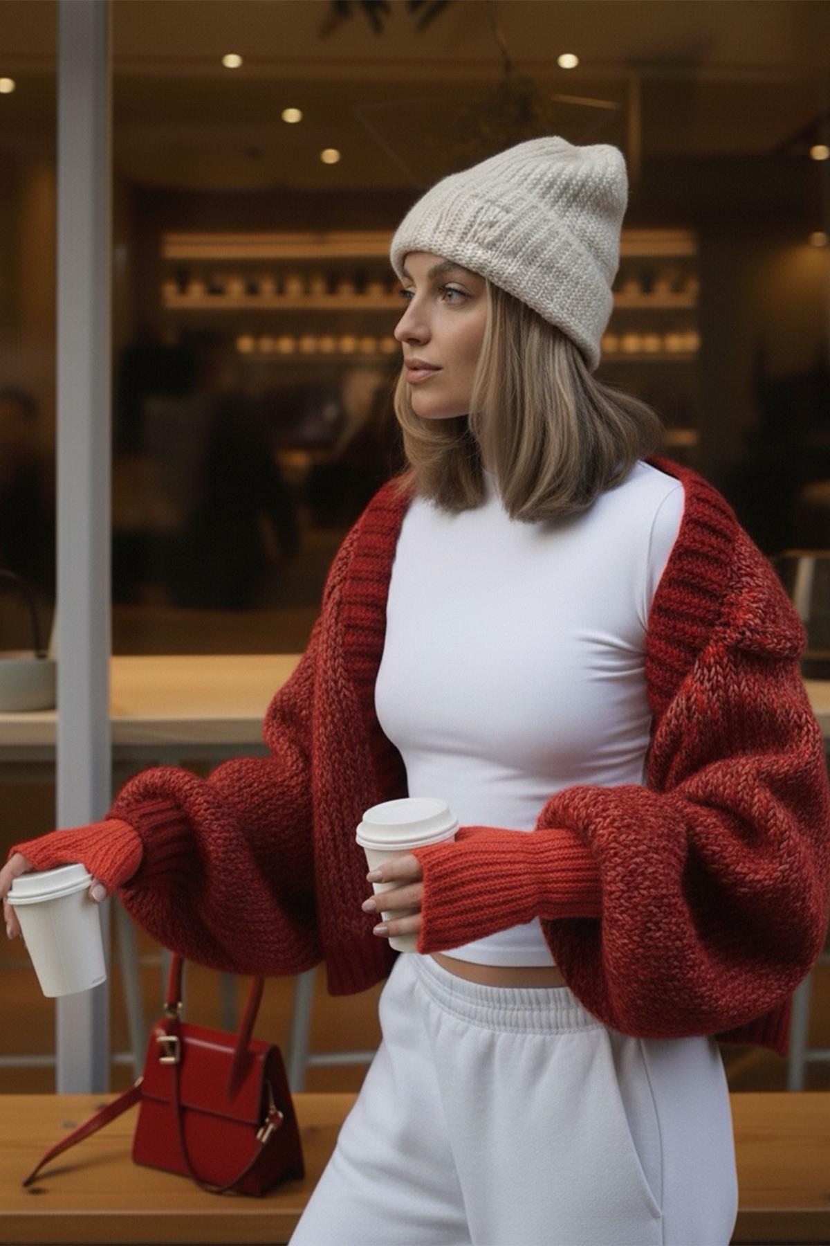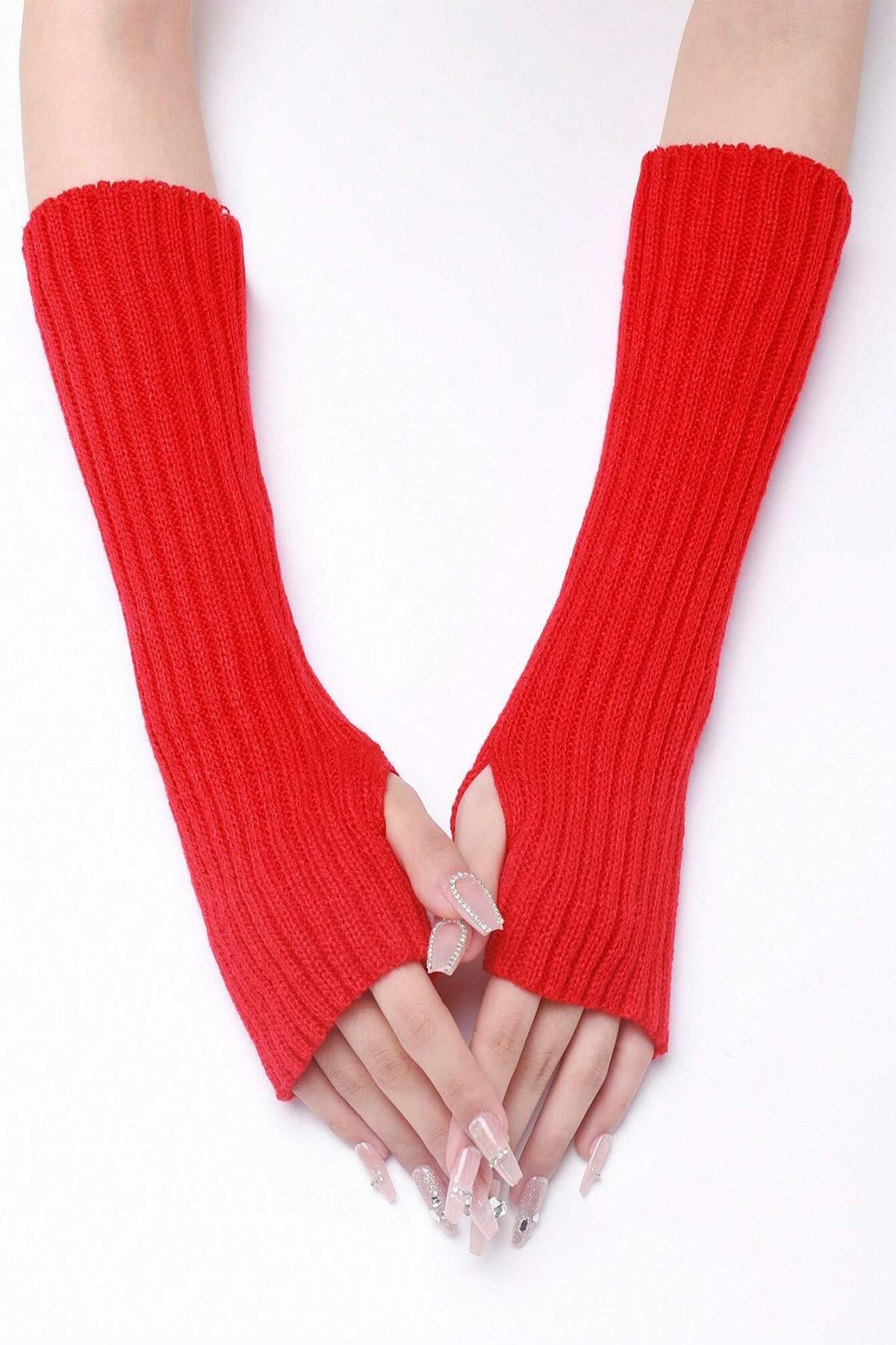 Kırmızı Triko Örgü El Isıtıcı Kolluk Parmaksız Eldiven (BHT-4811)